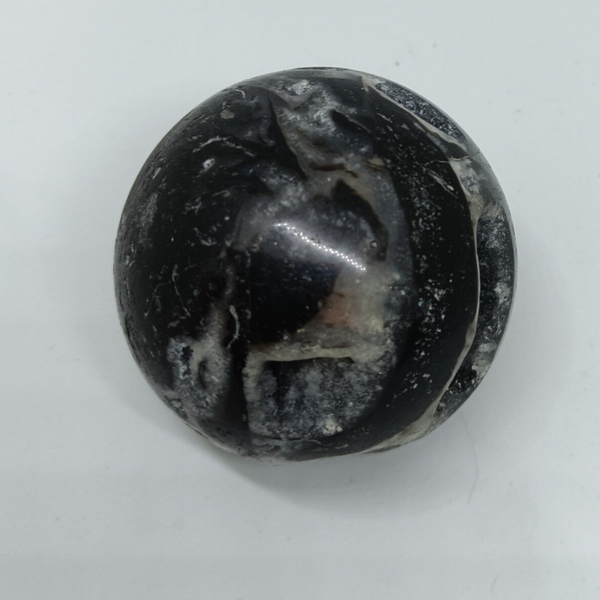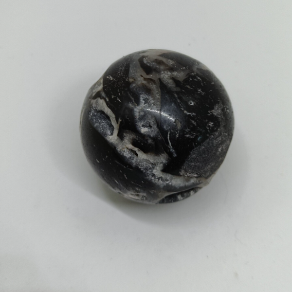 Kwarts bestaat er in vele vormen. Deze bol is van een onbekend zwart gesteente maar met prachtige heldere grijze kwarts insluitingen.